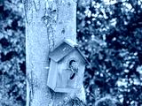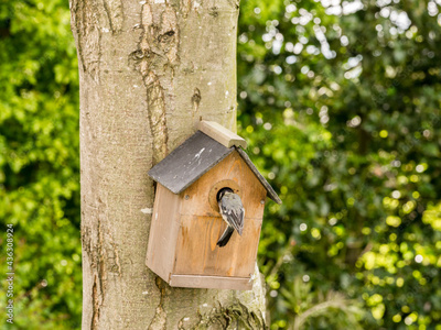 Parent blue tit entering garden nest box to provide food to their chicks and parent bird at Pickmere, Knutsford, Cheshire, Uk
