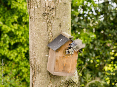 Parent blue tit entering garden nest box to provide food to their chicks and parent bird at Pickmere, Knutsford, Cheshire, Uk