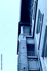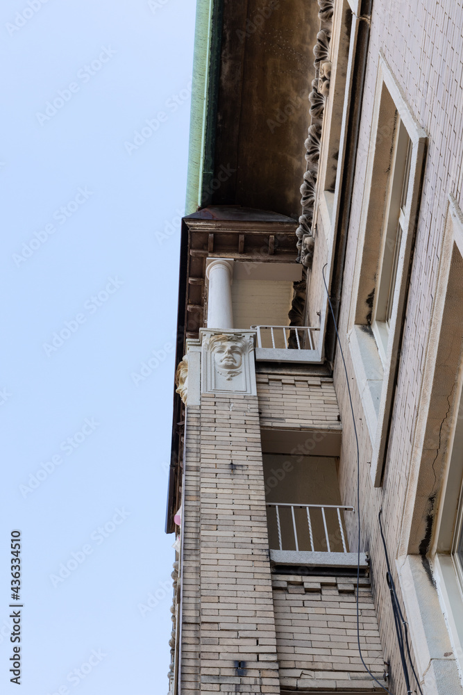 View looking up along wall of an old brick apartment building with decorative face elements, vertical aspect