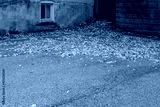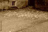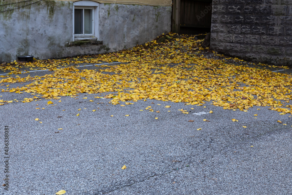 Corner of an asphalt parking lot between two old gray buildings, bright yellow fall leaves in urban landscape, horizontal aspect