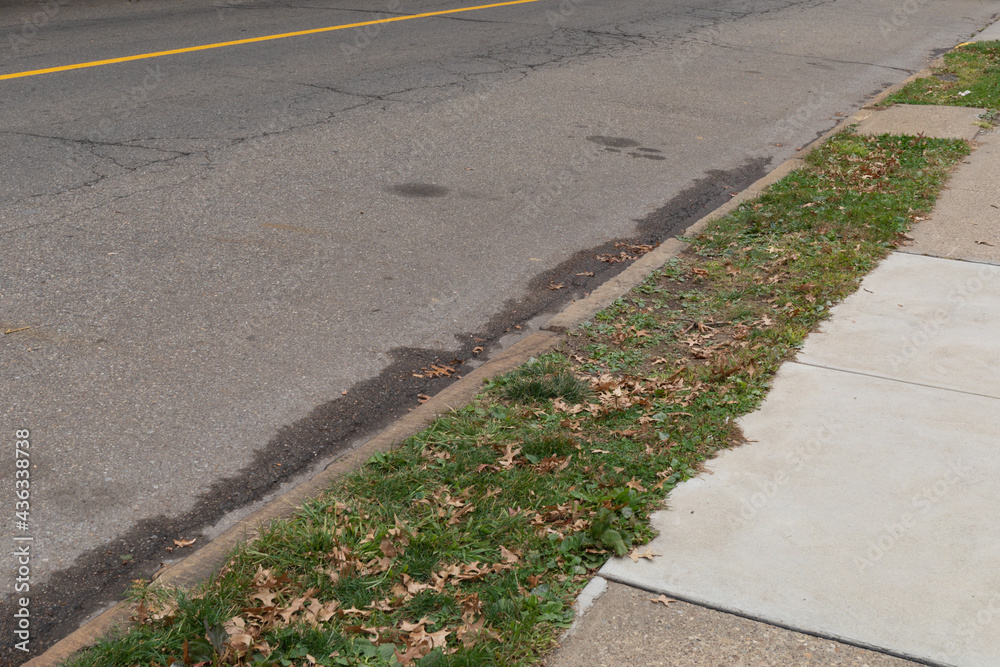 Stained asphalt street with grass strip and concrete sidewalk, horizontal aspect