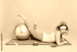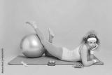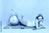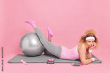 Lazy bored woman lies on yoga mat with fitness ball expanders and resistance band around feels tired after training poses at gym centre against pink background. Workout sport motivation concept