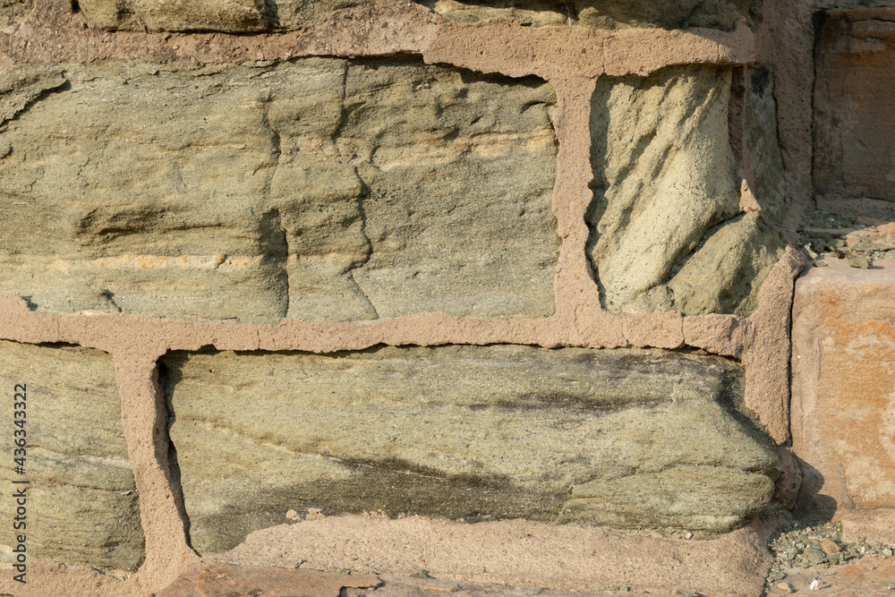 Background wall of green limestone and tan mortar, stone eaten away, horizontal aspect