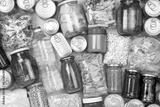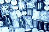 Food donations such as pasta, rice, oil, peanut butter, canned food, jam and other on white wooden table , top view
