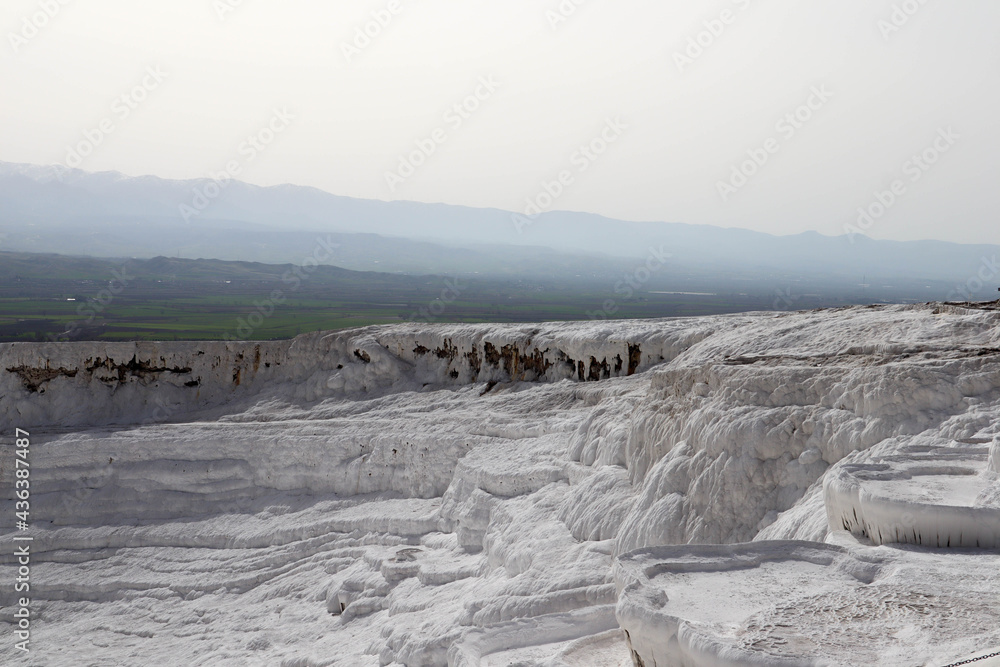 slopes of the valley covered by white carbonate mineral formations, travertines of Pamukkale, Turkey