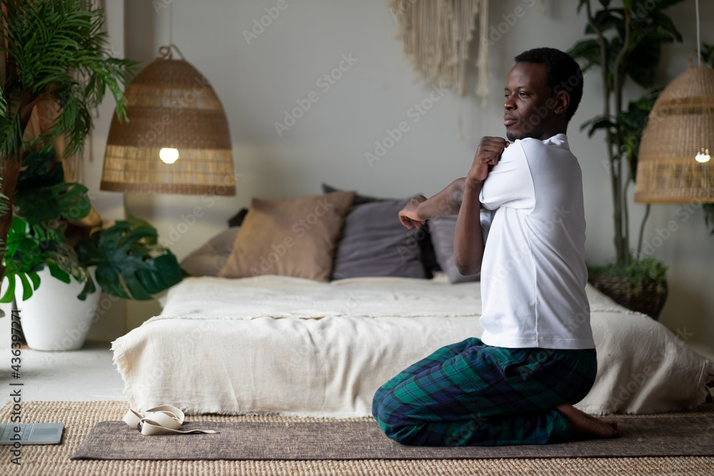 Young african man making asana exercises for shoulders stretching.