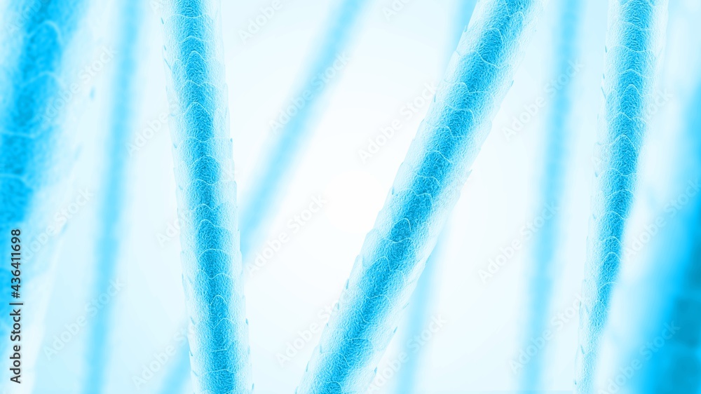 Human hair under the microscope. Close-up. Blue color. 3D illustration.