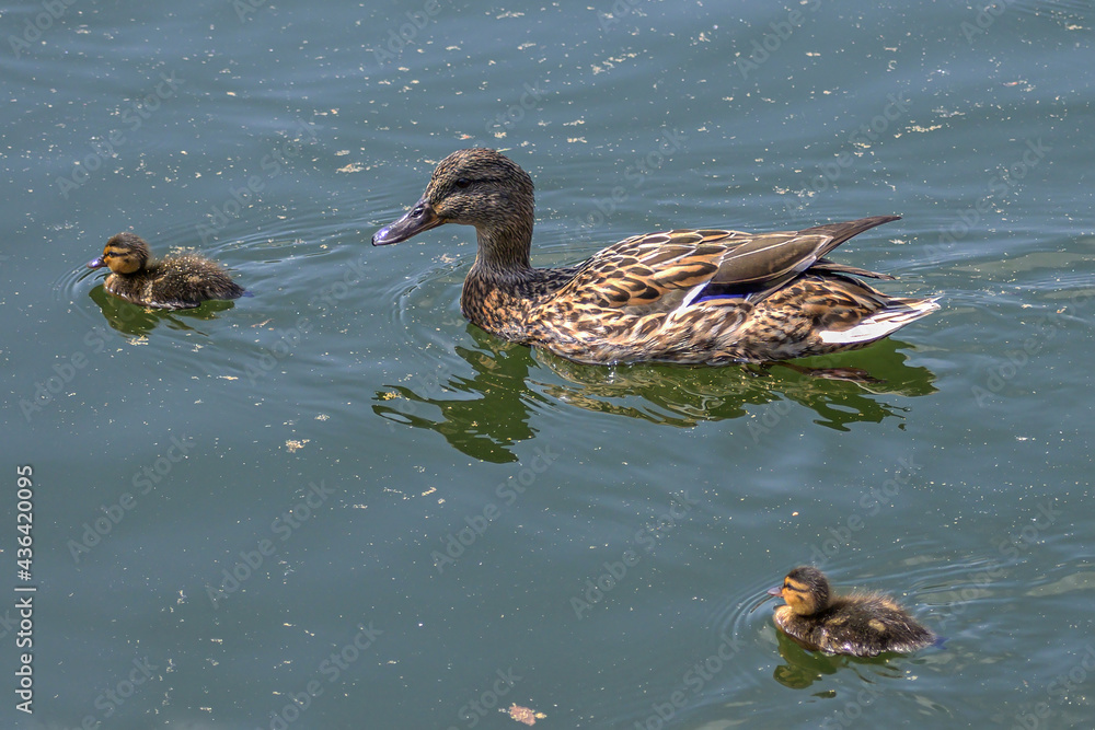 Duck with ducklings by the river on a sunny spring day