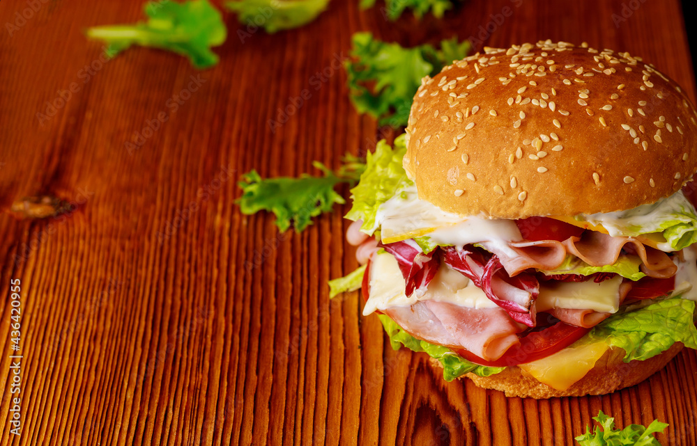 Burger with lettuce, cheese, ham and tomato on dark background.