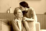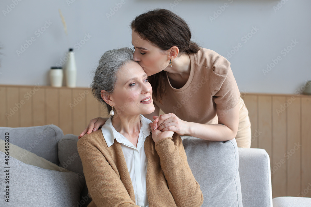 Happy daughter hugging older mother, standing behind sofa in living room, enjoying tender moment at home