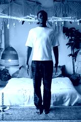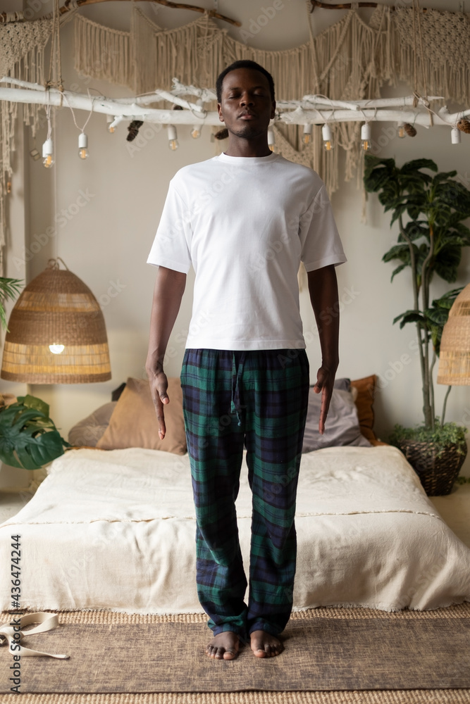 African man working out, yoga, pilates, fitness training, basic standing asana tadasana, mountain yoga posture