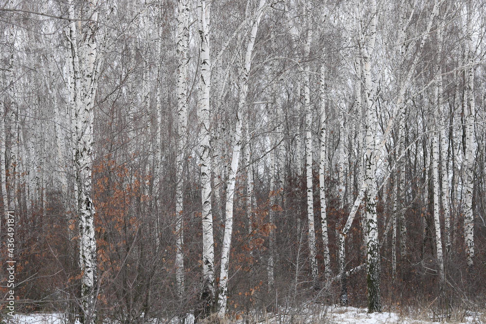 Young birches with black and white birch bark in winter in birch grove against background of other birches