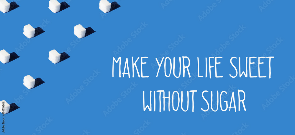 Refined sugar on a blue background with text - Make your life sweet without sugar