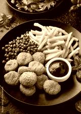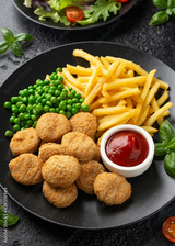 Fried crispy chicken nuggets with ketchup, french fries and green peas in black plate