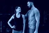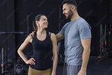 Athlete couple having fun after workout. Smiling woman talking to male friend at the gym.