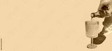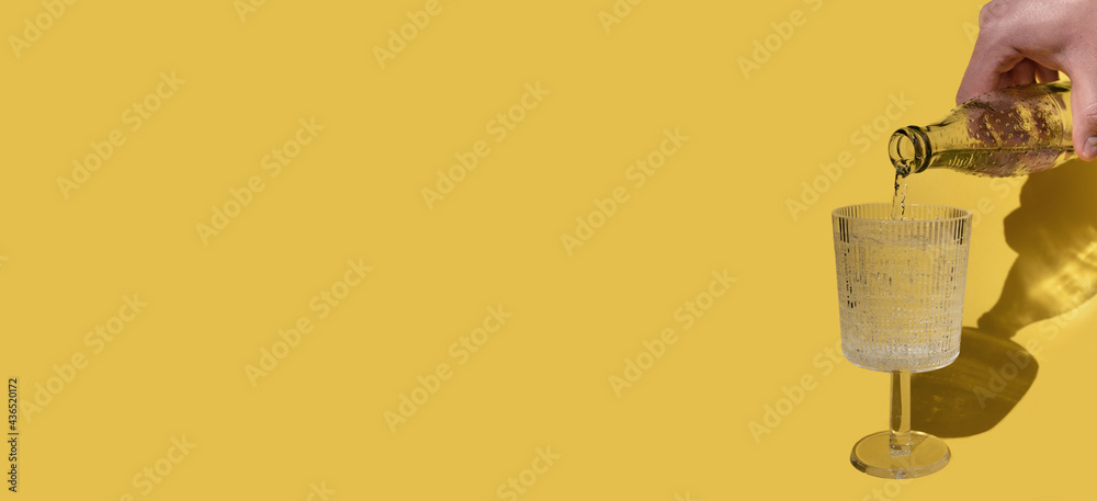 Man hand pouring water on glass on yellow background with shadows on sunlight of sunset or sunrise. Place for text. Trendy minimal concept