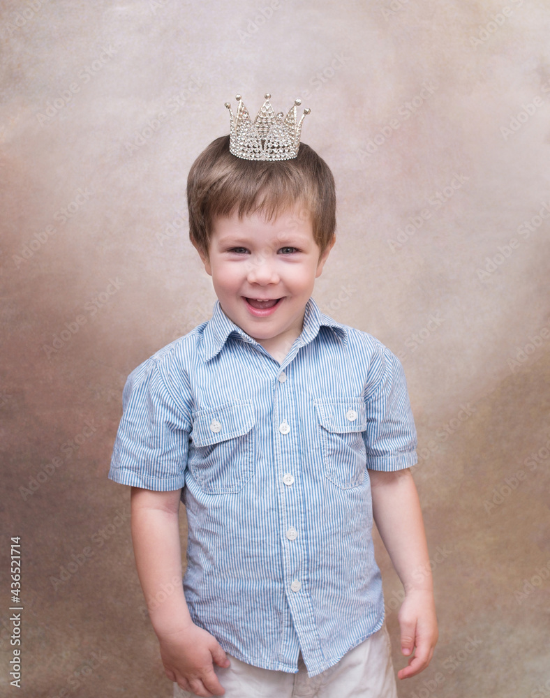 Little boy, king smiling in crown, dreamer. Leader, royal concept, prince