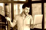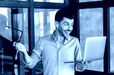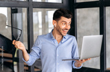 Surprised successful joyful caucasian business man or manager standing in the office, holding a laptop in his hand, communicating with colleagues via video conference, looking at the screen, smiling