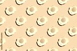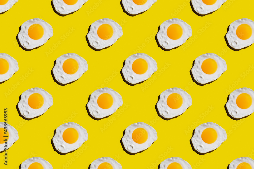 Fried egg pattern on bright yellow background. Abstract background food pattern