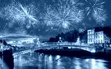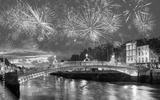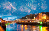 Ha'Penny Bridge at twilight blue hour with fireworks - Dublin, Ireland