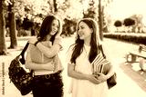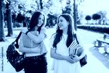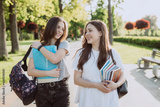 Two happy smiling student girls are walking and talking to each other on campus on a warm sunny day. Soft selective focus.