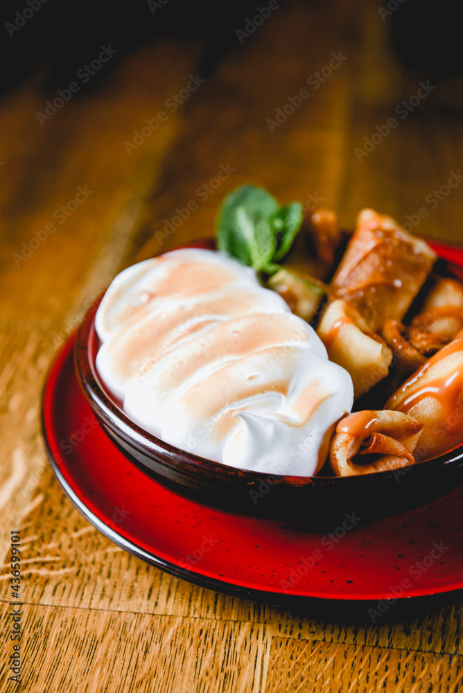 Close up of french style crepes with souffle whipped cream served on a plate over rustic wooden table background.