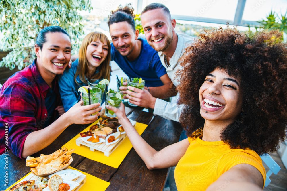 Multiracial friends taking selfie at bar restaurant - Young people having fun together celebrating happy hour on cocktail pub - Friendship, youth and summer concept