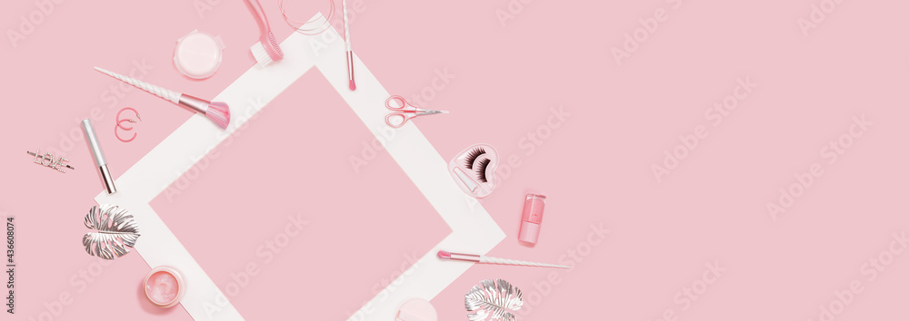 Tender pink monochrome feminine makeup tools and silver accessories. brushes eye lashes vanish on candy pink. Flat lay, birthday beauty cosmetics blogger advert border concept. Heart, love hair clips