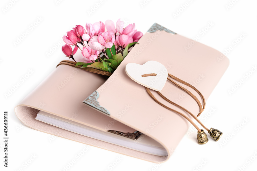 Notebook or diary with heart shape tie lock on white. Pink spring or summer flowers. Memories or love wedding gift concept