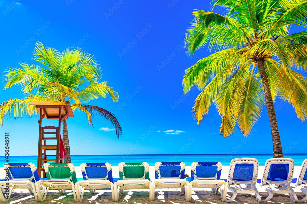Coconut palm trees with sunloungers on the caribbean tropical beach. Saona Island, Dominican Republic. Vacation travel background