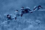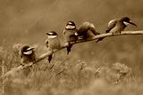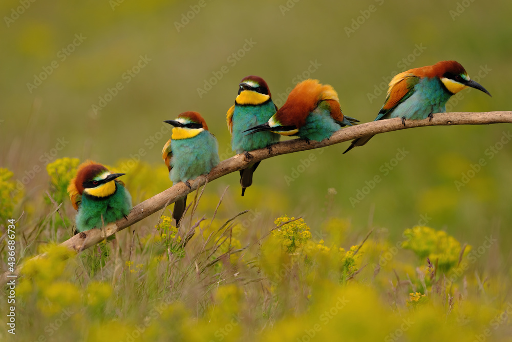 Group of colorful bee-eater on tree branch, against of yellow flowers background