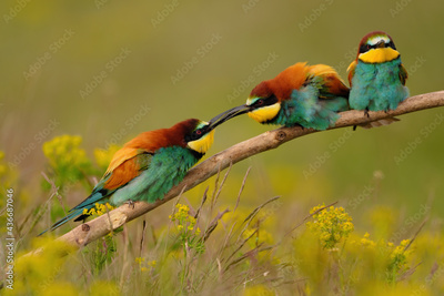 Group of colorful bee-eater on tree branch, against of yellow flowers background