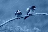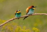 Group of colorful bee-eater on tree branch, against of yellow flowers background