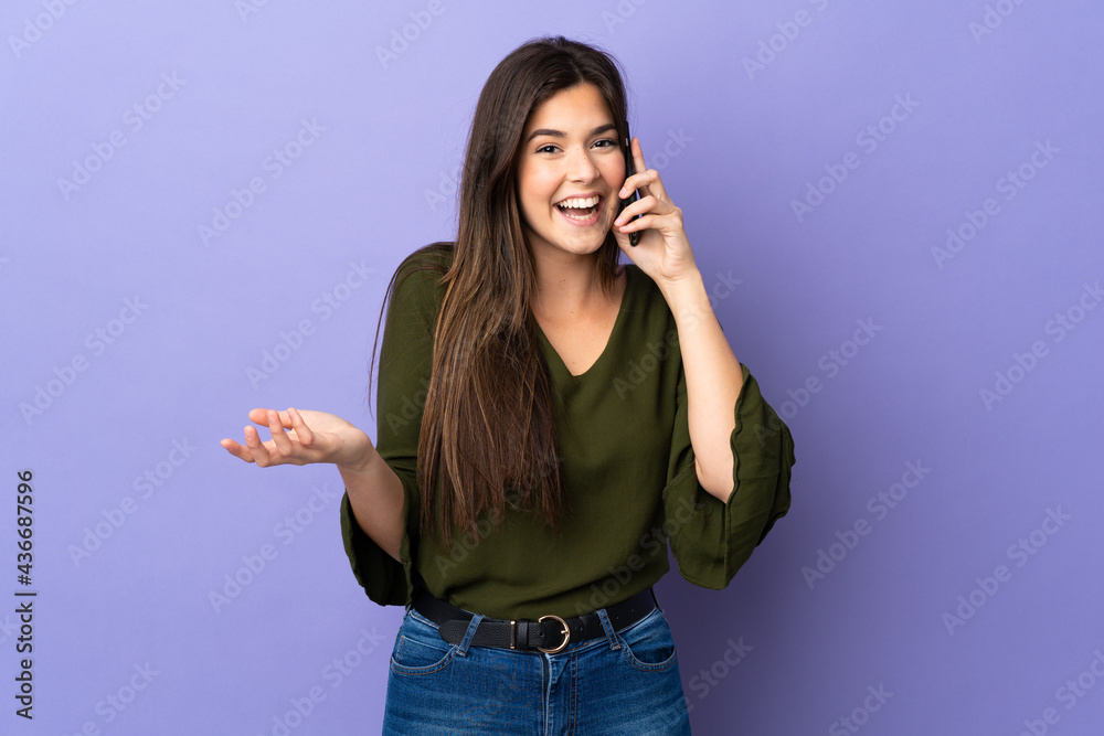 Teenager Brazilian girl over isolated purple background keeping a conversation with the mobile phone with someone