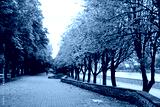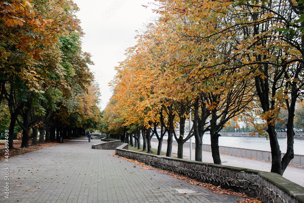 Empty road in a city park in autumn. Yellow trees, crumbling chestnut leaves in autumn.