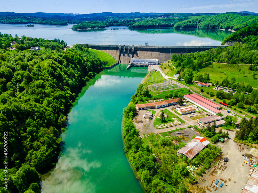Hydroelectric Water Power Plant on Solina Lake in Poland. Drone View. Renewable Green Energy