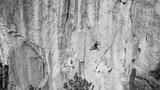 DRONE: Female climber learning to top rope looks for a hold in the natural wall.