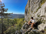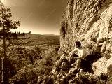 COPY SPACE: Male rock climber rests at the bottom of a cliff and observes valley
