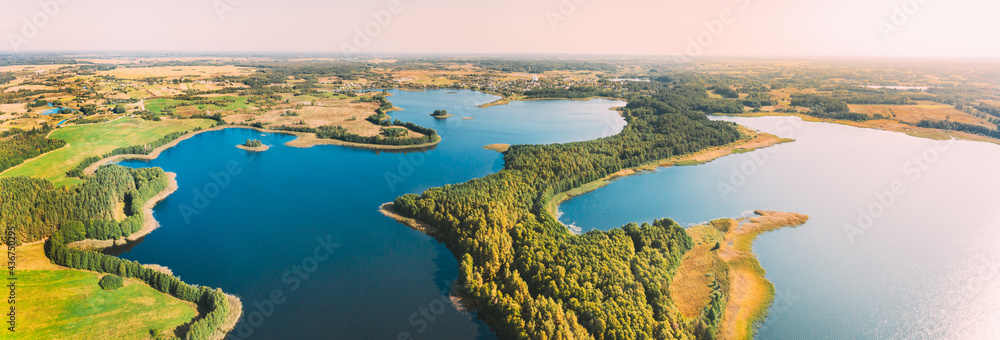 Braslaw District, Vitebsk Voblast, Belarus. Aerial View Of Nedrovo Lake, Green Forest Landscape. Top View Of Beautiful European Nature From High Attitude. Bird's Eye View. Famous Lakes. Panorama