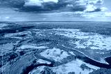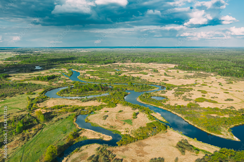 Aerial View Green Forest Woods And River Landscape In Sunny Summer Day. Top View Of Beautiful European Nature From High Attitude In Spring Season. Drone View. Bird's Eye View