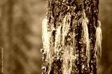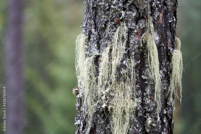 Closeup shot of white usnea lichens grown on a tree on a blurred background
