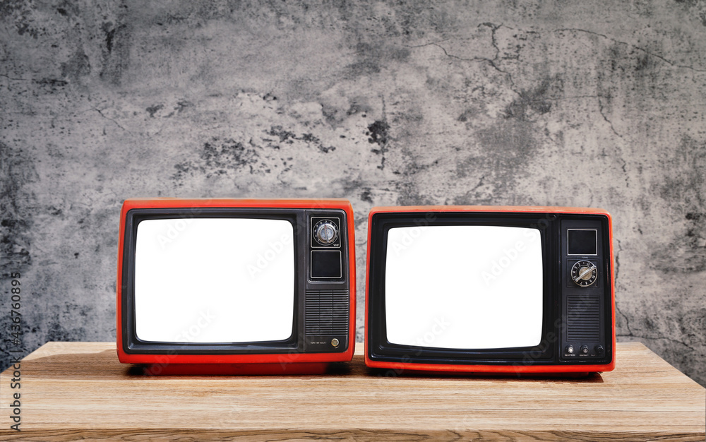 Two old red retro televisions with cut white screen on wooden table in front of the cement wall background.