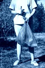 A volunteer collects plastic bottles in the forest. The girl holds a bag of garbage in her hands and shows a gesture with her hand: great, class. Concept call to protect the environment, the planet