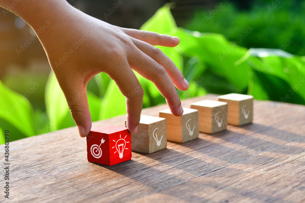 cubes with head symbols and hand that flips one revealing an idea. Concept of New idea creativity and inspiration. Icon Light bulb In the hands of business people Show the word Idea