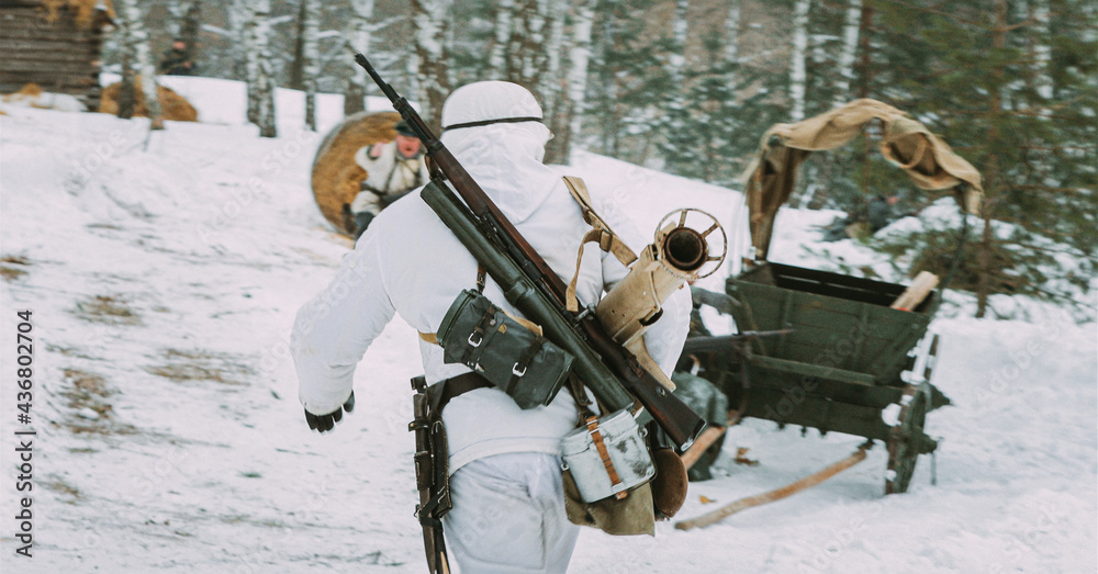 German Wehrmacht Infantry Soldier In World War II Soldiers Running With Anti-tank Gun Panzerschreck In Winter Forest. Historical Re-enactment. WWII. Winter Snowy Day.