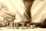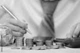 Businessman using caculator income saving money and investment concept. Money coin stack growing graph Balance savings Interest and Advertising coins of finance and banking