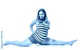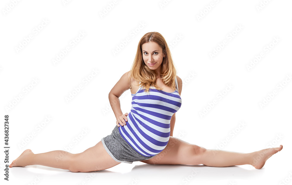 Pregnant woman with big belly doing sport exercises and sits on twine at studio over white background. Pregnancy, healthy active lifestyle