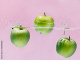 Green apples thrown into the clean water against pastel pink background. Fresh summer fruit in transparent water. Floating and immersed apples, drops of water. Creative food concept.