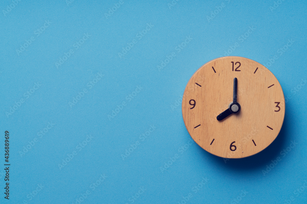 Retro alarm clock at 8 o'clock on blue table background, vintage lifestyle concept
