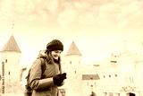 Tallinn, Estonia. Young Caucasian Woman Backpacker Tourist Enjoying Life, Smiling And Using Smartphone Near Landmark Viru Gate. Vacation In Old Town. Girl Surfing Net Internet In Phone